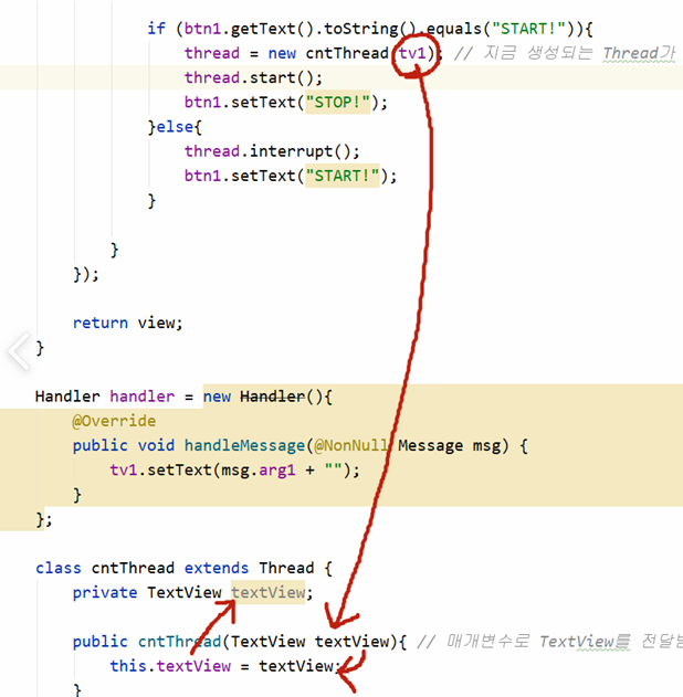 thread = new cntThread(tv1); // 지금 생성되는 Thread가 필요한 TextView를 보내줘야함(매개변수)