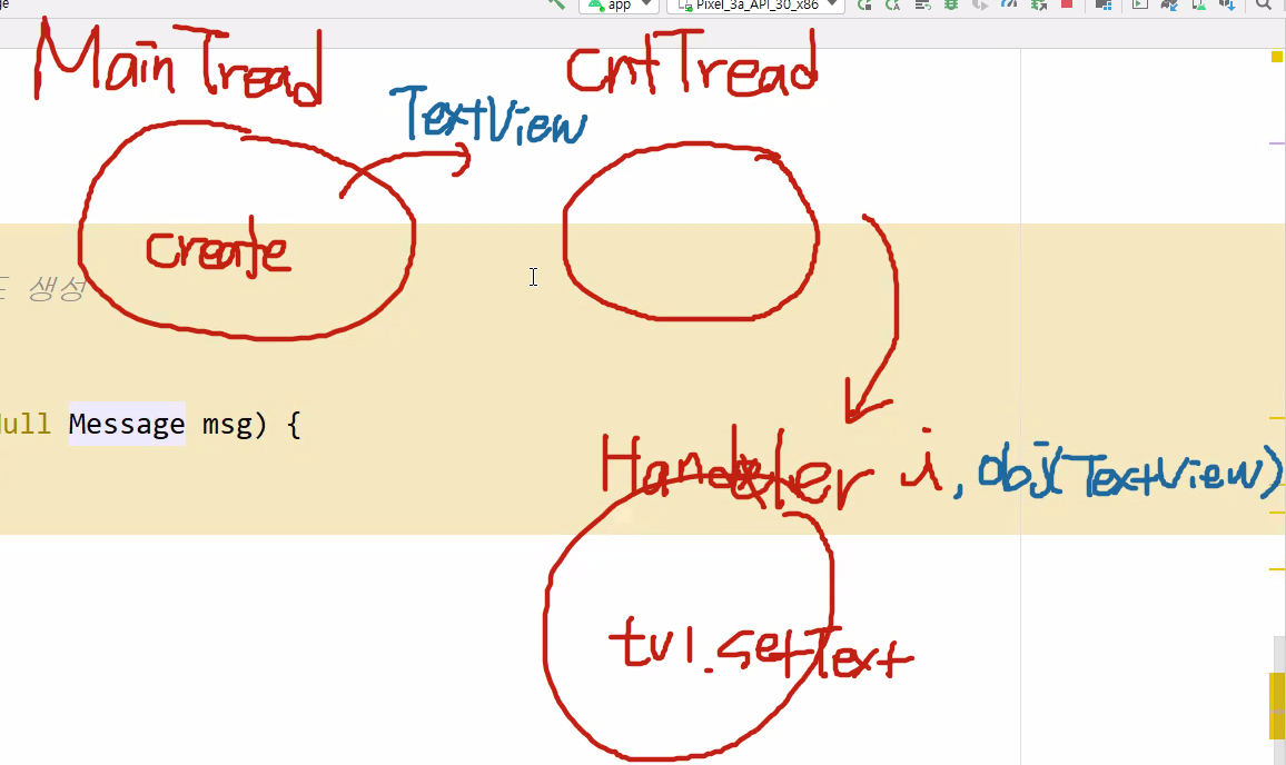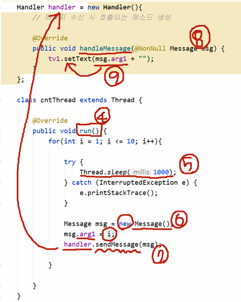 ((TextView)msg.obj).setText(msg.arg1 + ""); // setText 할 때 정수형을 넣으면 에러!! (정수형을 참조할 주소값으로 인식함)