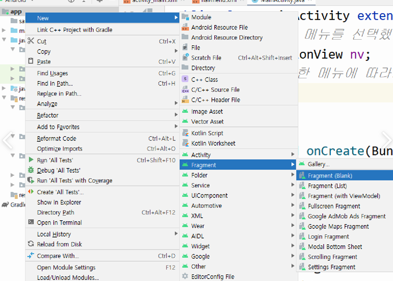 4개의 메뉴에 들어갈 fragment 4개 만들기